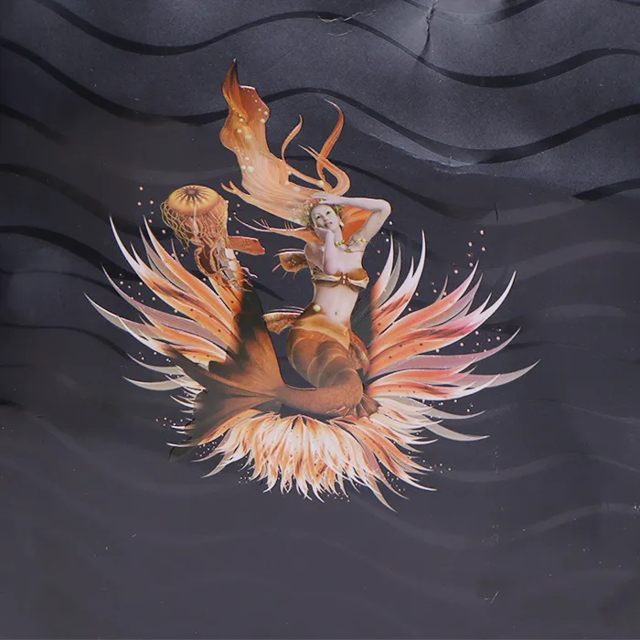 О: Процесот на логото комбинира печатење во боја со втиснување. Ова ја подобрува тродимензионалноста и додава богатство на шарената шема или лого во луксузните торби за купување. Логоата, со нивните богати бои, се печатат за да се прикаже висока заситеност, а потоа се користи втиснување за делумно подигање на површината на хартијата, создавајќи тродимензионален тактилен и визуелен ефект.